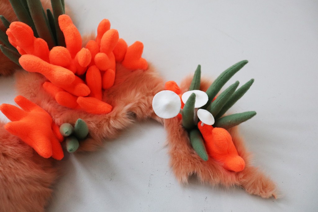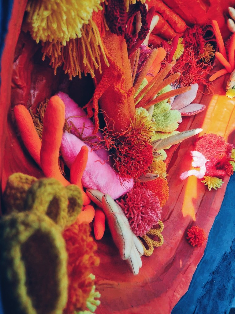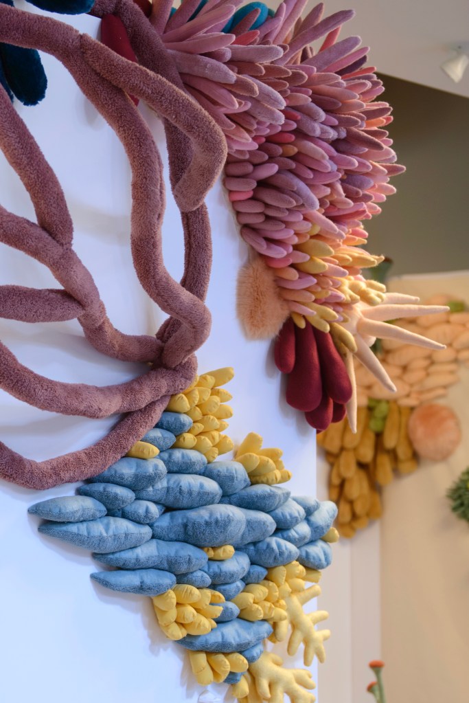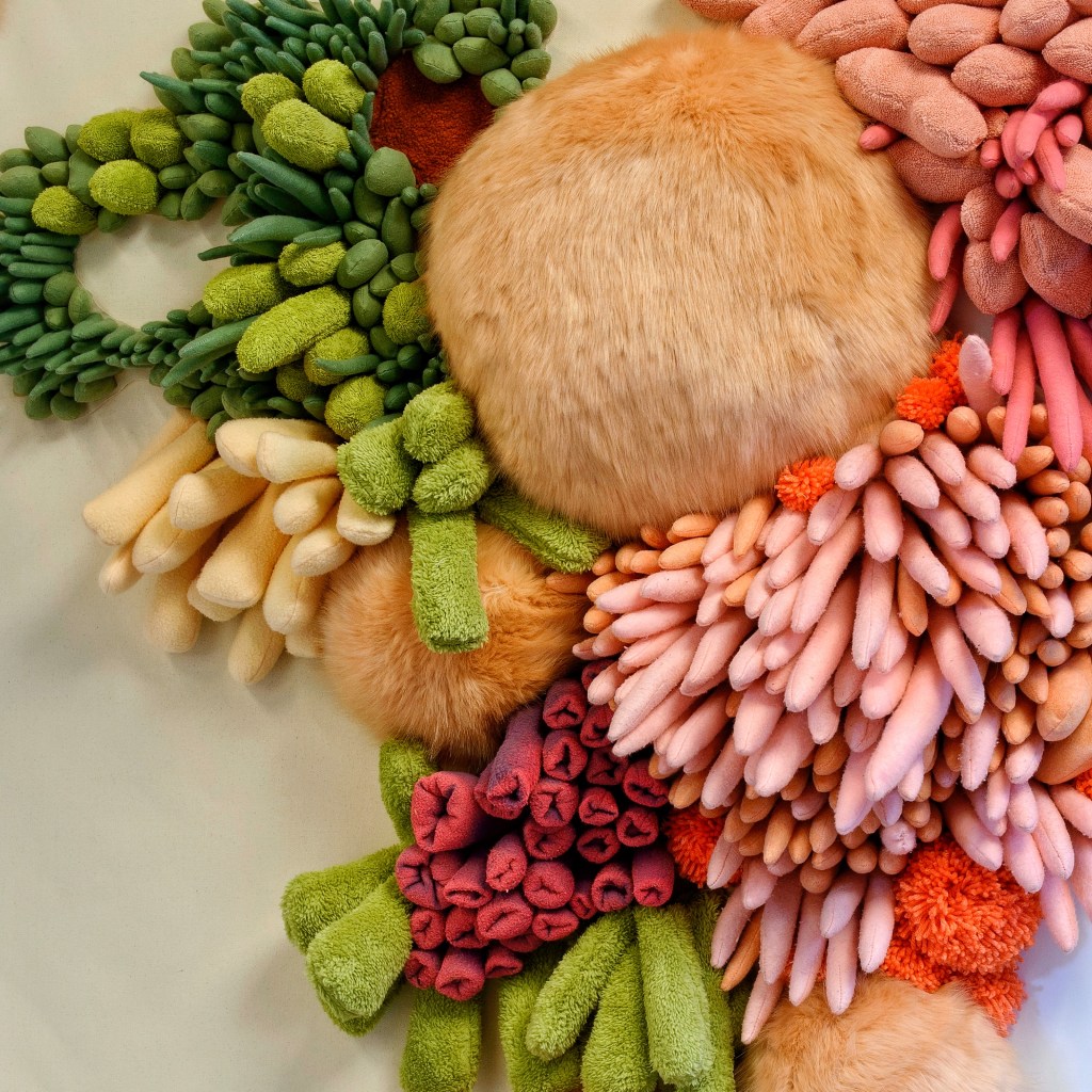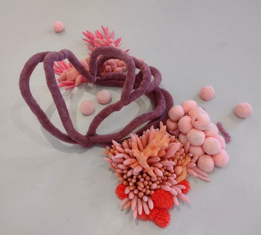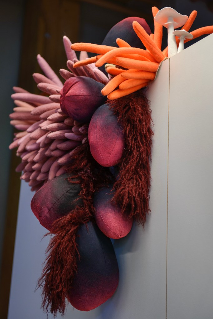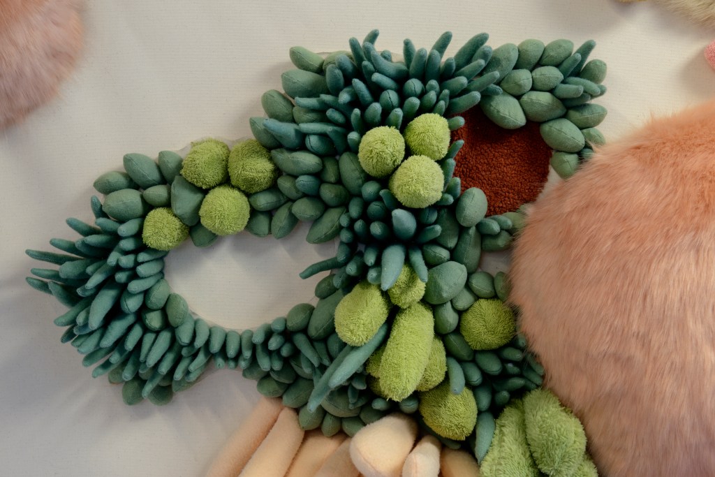 Avec son exposition Ecomorphismes, Emy G. St-Laurent nous plonge dans un écosystème coloré et complexe peuplé d’organismes hybrides possédant des caractéristiques tant animales que végétales. S’intéressant depuis son plus jeune âge à la nature et pratiquant une observation minutieuse de celle-ci, elle développe son propre environnement textile foisonnant inspiré par les études de la biologie. Ces chimères font ensuite elles-mêmes l’objet d’une analyse rigoureuse à travers une production picturale figurative réaliste. D’œuvre en œuvre se dessine ainsi une étrange généalogie faite d’interconnexions formelles entre les êtres bidimensionnels et tridimensionnels qui composent le corpus. Ce projet réalisé dans le cadre des études à la maîtrise de l’artiste vise à incarner une ode à la richesse du vivant et au plaisir de sa découverte.